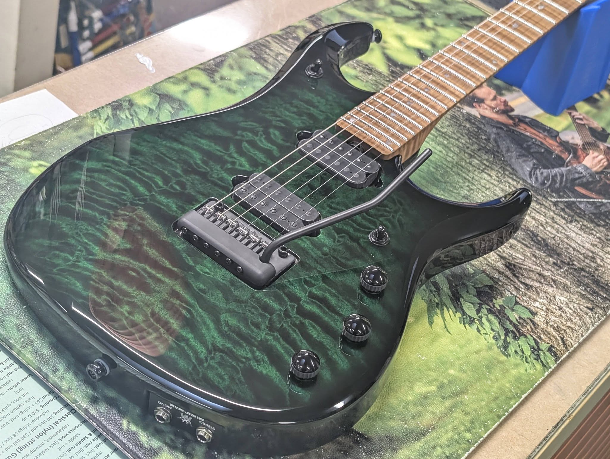 The JP15 features a lightweight okoume body with a quilt-figured maple top in the Green Tiger Eye finish. The beautifully figured roasted maple neck and fingerboard deliver a smooth, fast-playing surface enhanced by stainless steel frets and a hand-rubbed oil and wax finish for natural comfort. Electronics include DiMarzio Illuminator pickups, a piezo-equipped bridge for realistic acoustic tones, and an onboard 20+dB gain boost for added punch and tonal range.