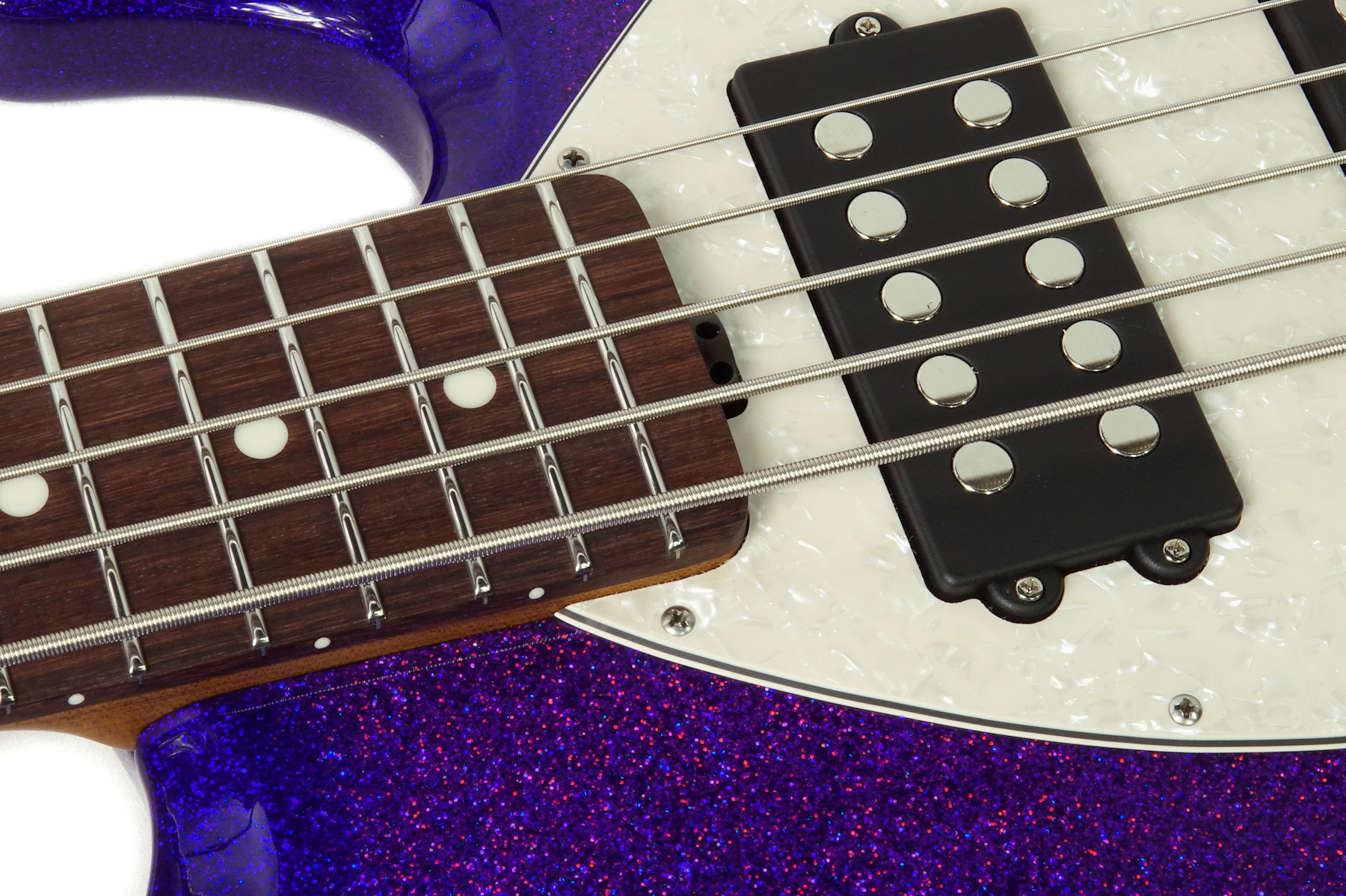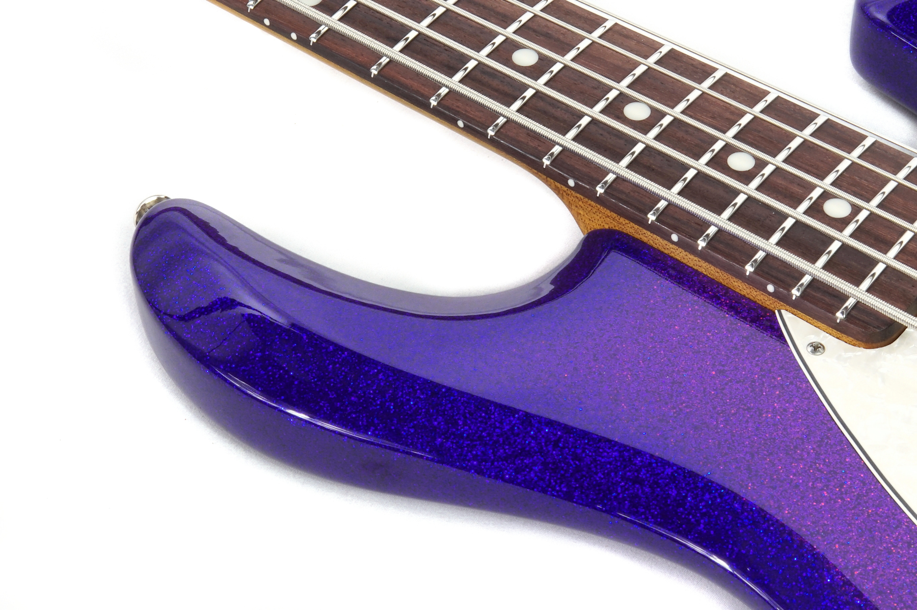 Violet Sparkle Burst pairs a burst sparkle finish with a vintage white pearloid pickguard, chrome hardware, and a roasted maple neck with rosewood fretboard.